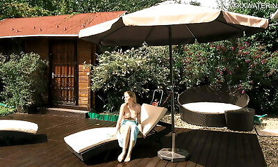 uber-cute tart stochert sich mit dildo in der nähe des pools - solo