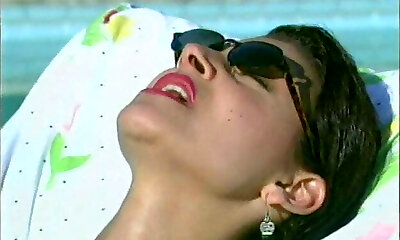 Young neighbor came to help dark haired milf to smear her fake tits with sunscreen while she sunbathes by the pool